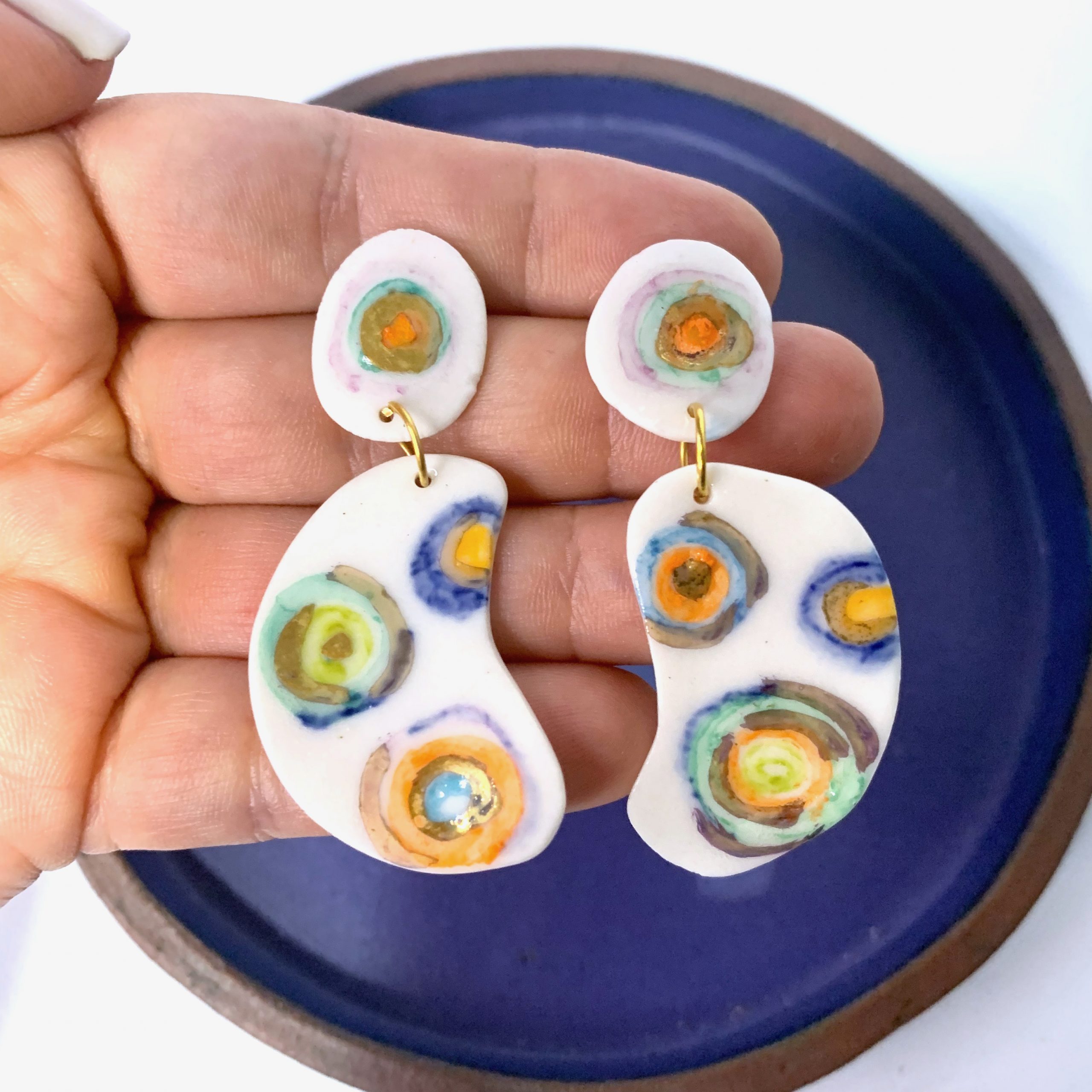 Aretes modelados en porcelana y pintados a mano con oro . Accesorios en acero.